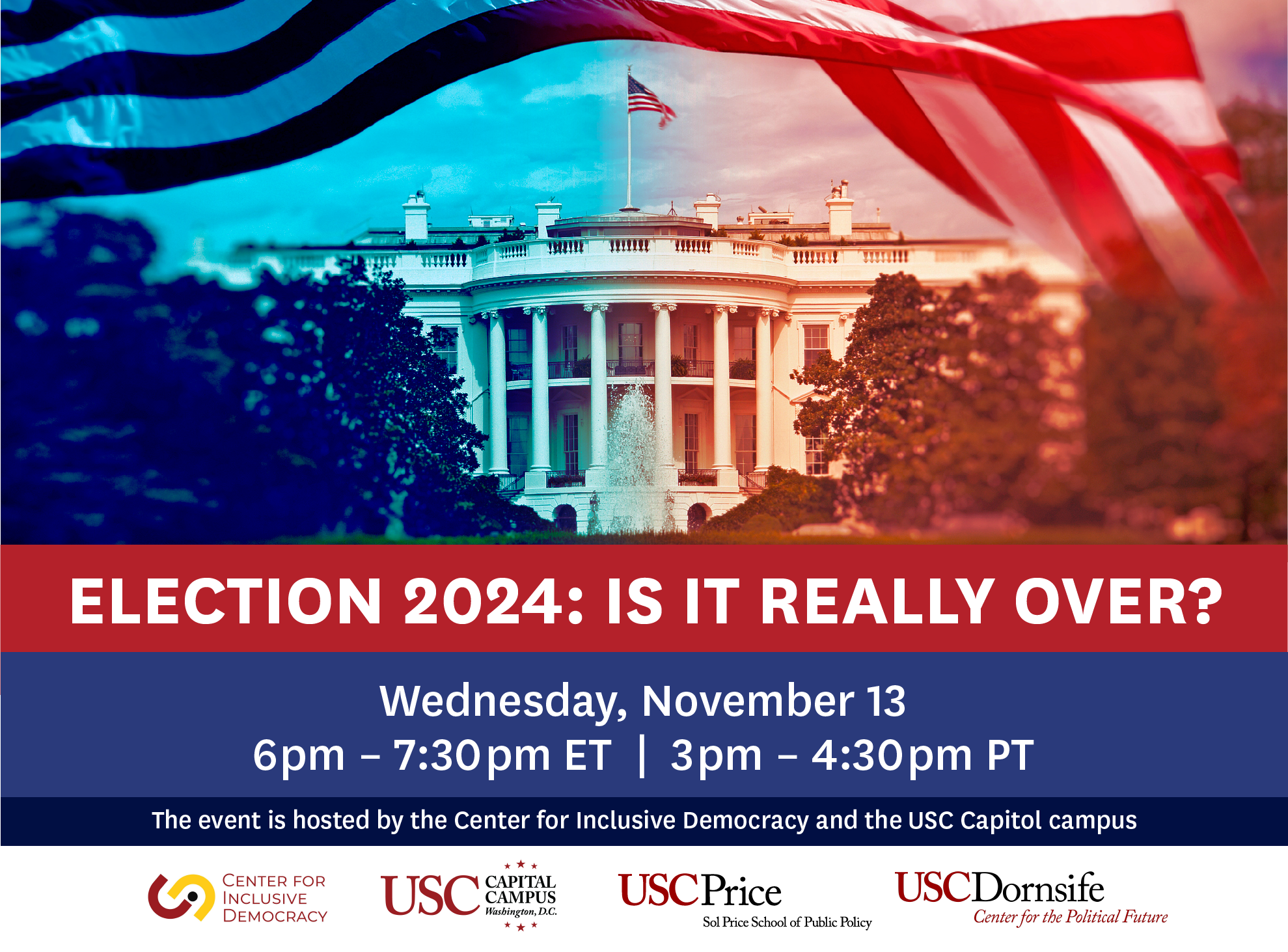 On November 13, the Center for Inclusive Democracy and the USC Capital Campus held the first event in our two-part post-election series: “Election 2024: What Just Happened?” This panel, entitled “Election 2024: Is it Really Over?” will feature a conversation on who voted, how accurate the polls were, how officials managed the election, and the challenges ahead for U.S. democracy.